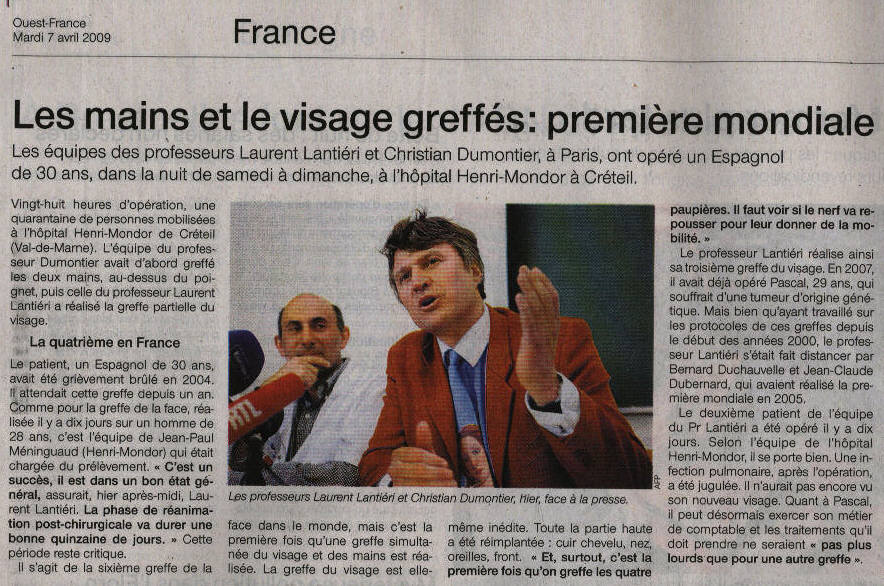 [Greffe] Les mains et le visage greffés: première mondiale- Ouest-France du 07/04/09 |