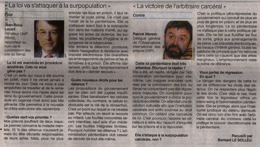 + deux avis, l'un pour, sénateur UMP "la loi va s'attaquer à la surpopulation" et l'autre contre, "la victoire de l'arbitraire carcéral".